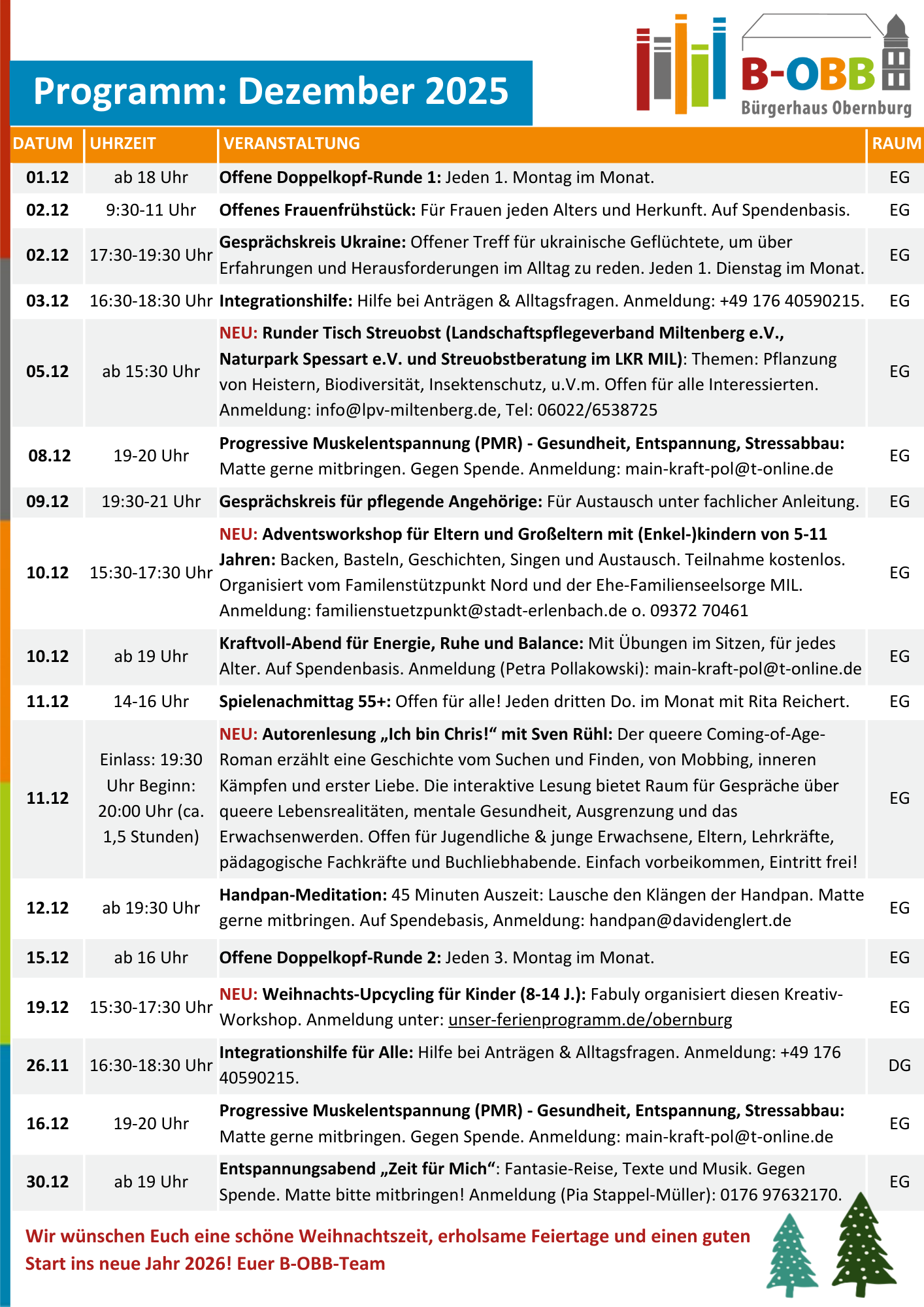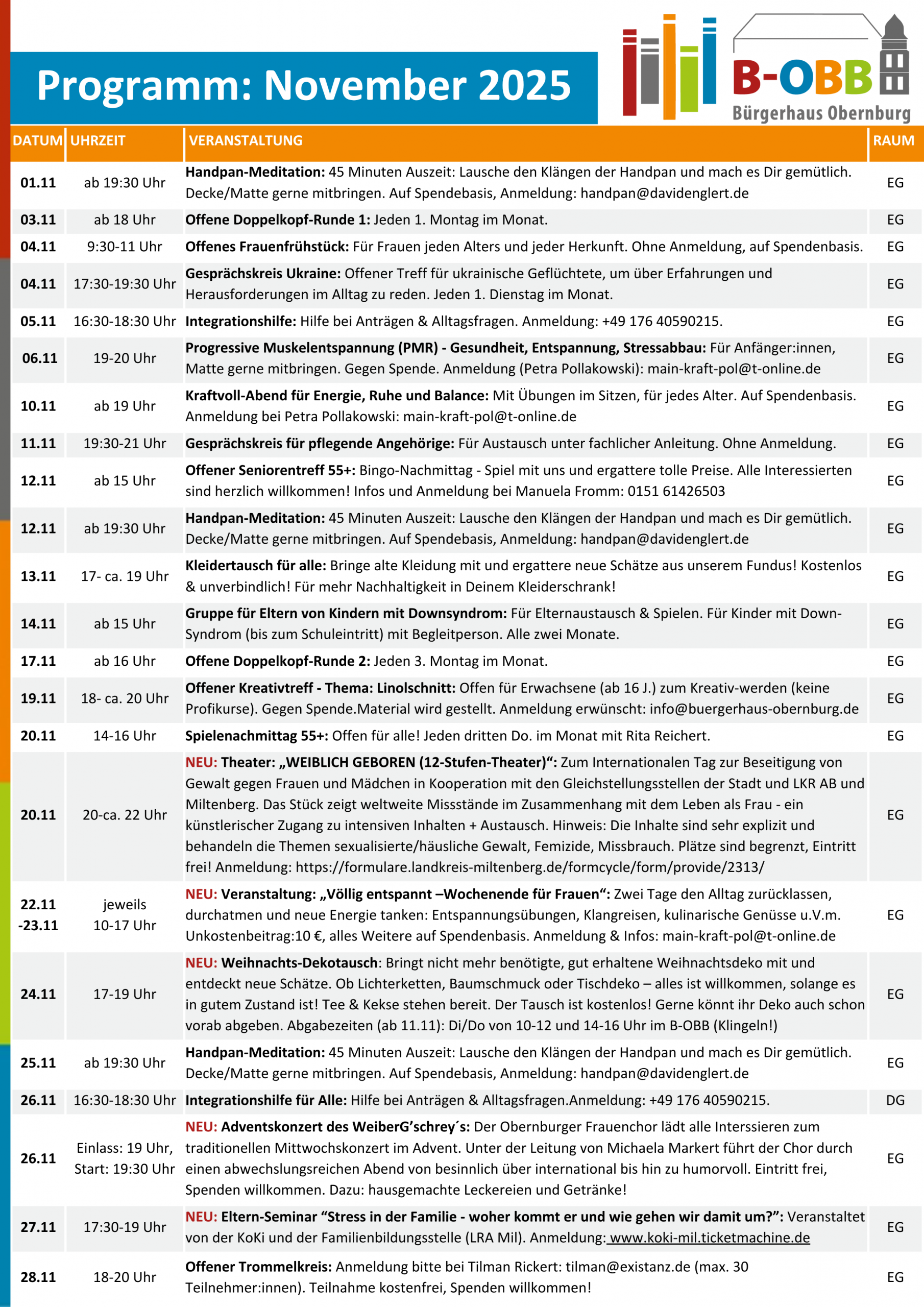| 08.01 | ab 19 Uhr | Entspannungsabend „Zeit für Mich“…mit Fantasie-Reise, Texten und Musik ab 19 Uhr im EG, Anmeldung bei Pia Stappel-Müller: 0176 97632170, auf Spendenbasis, Matte, Decke, Kissen bitte mitbringen! Infos hier | EG |