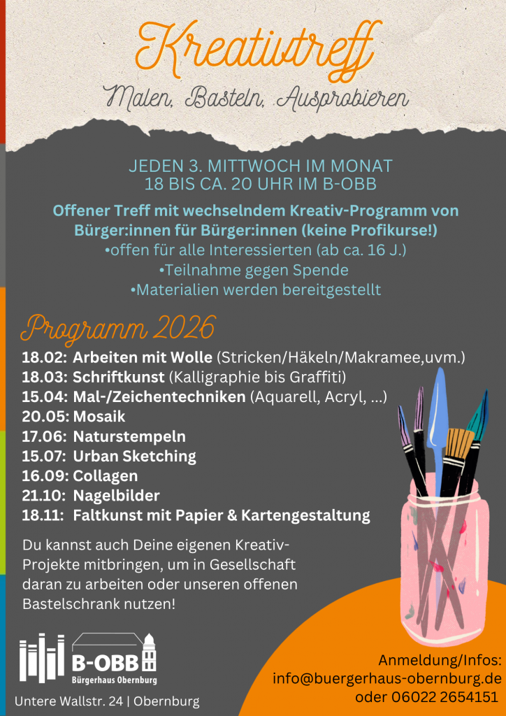 An jedem 3. Mittwoch im Monat findet der offene Kreativtreff von 18 bis ca. 20 Uhr im B-OBB (EG) statt, um gemeinsam kreativ zu sein, Neues auszuprobieren und in entspannter Atmosphäre zusammenzukommen.