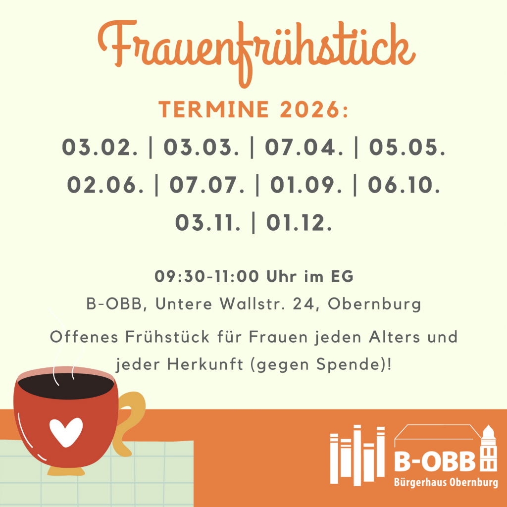 Es ist ein offenes Frühstück für Frauen jeden Alters und jeder Herkunft von 09:30 bis 11 Uhr im Erdgeschoss des B-OBBs (ohne Anmeldung). Ihr müsst nichts mitbringen, alles wird vor Ort bereitgestellt, dafür freuen wir uns über eine kleine Spende für die Einkäufe.