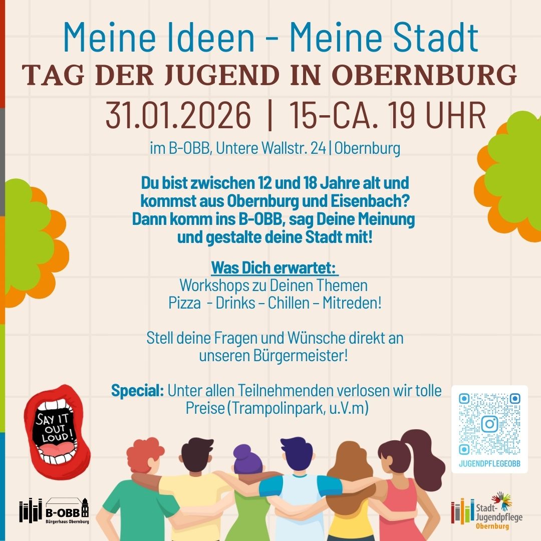 Am 31.01.2026 gehört Obernburg euch. Wenn du zwischen 12 und 18 Jahre alt bist und aus Obernburg oder Eisenbach kommst, laden wir dich herzlich ins B-OBB ein, um deine Ideen, Wünsche und Meinungen einzubringen. Deine Stimme zählt – und du kannst aktiv mitgestalten, wie deine Stadt in Zukunft aussieht.