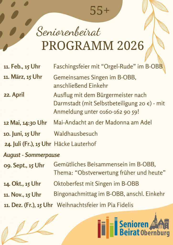 Jeden 2. Mittwoch des Monats findet ab 15 Uhr der offene Seniorentreff statt mit wechselnden Angeboten im B-OBB und Ausflügen. Mit wechselnden Aktionen passend zur Jahreszeit schafft der Seniorenbeirat ein tolles Angebot für Menschen 55+. Kommt vorbei, wir freuen uns auf Euch!
