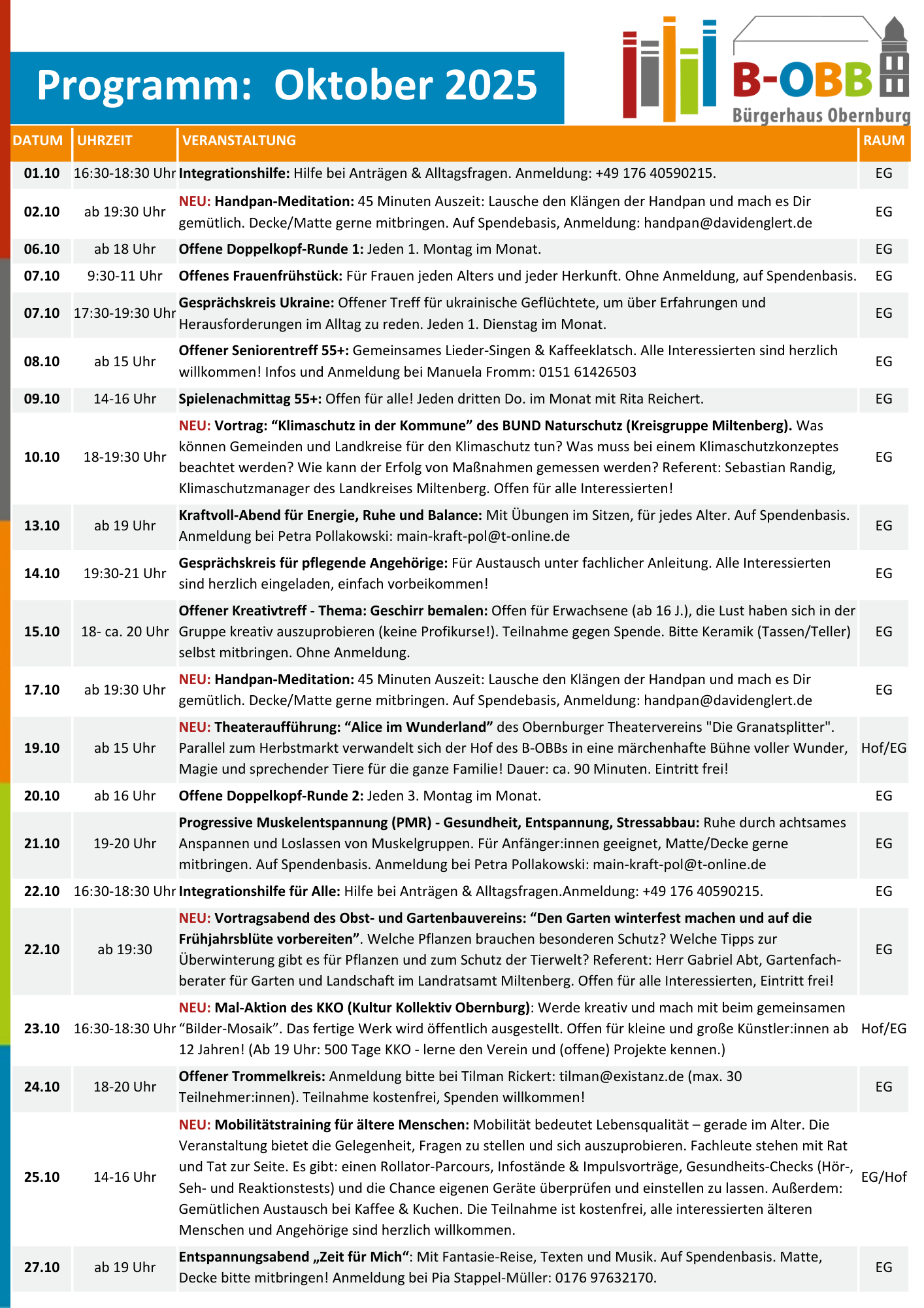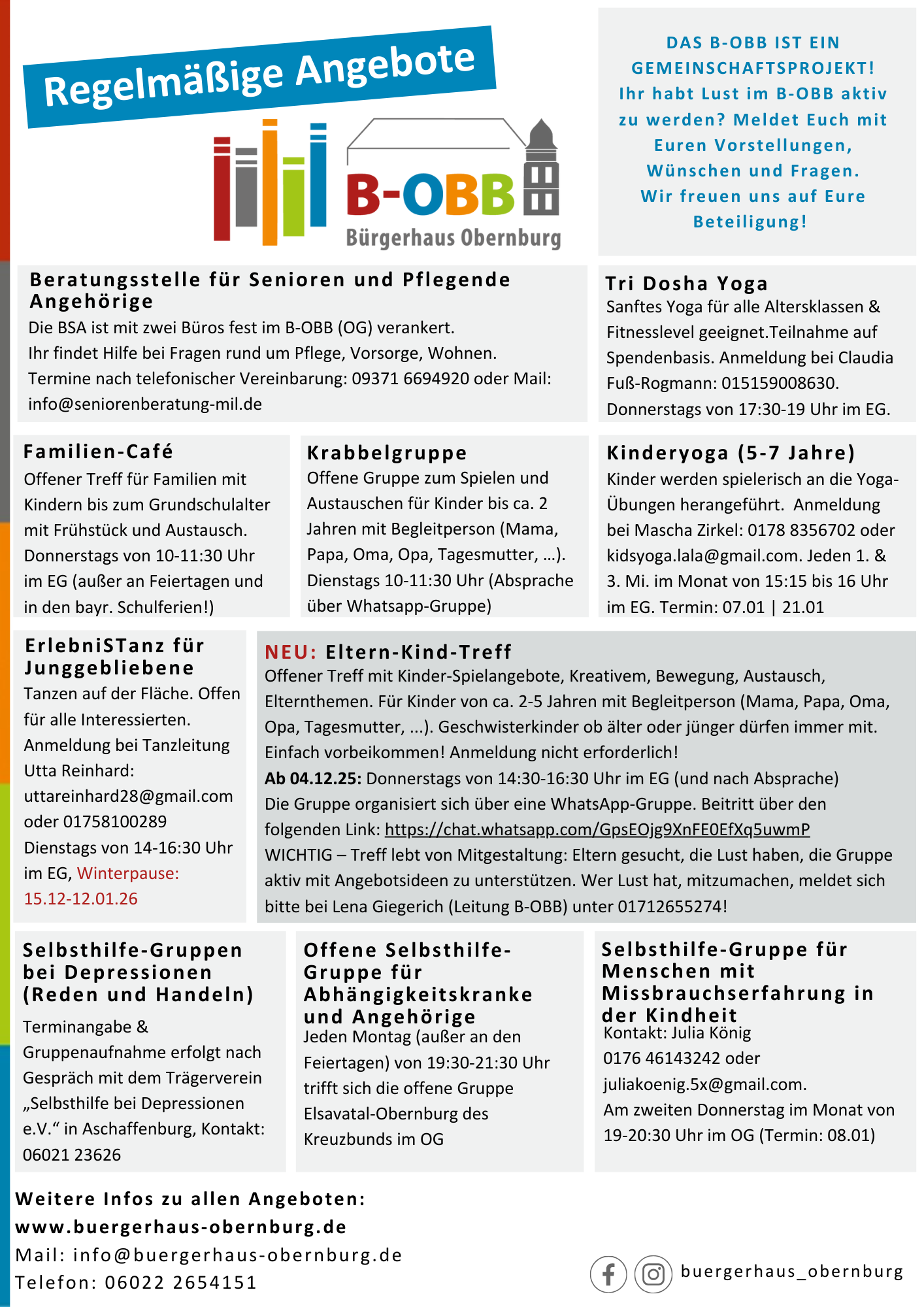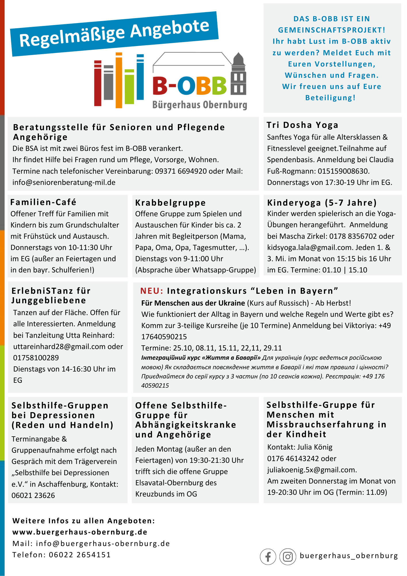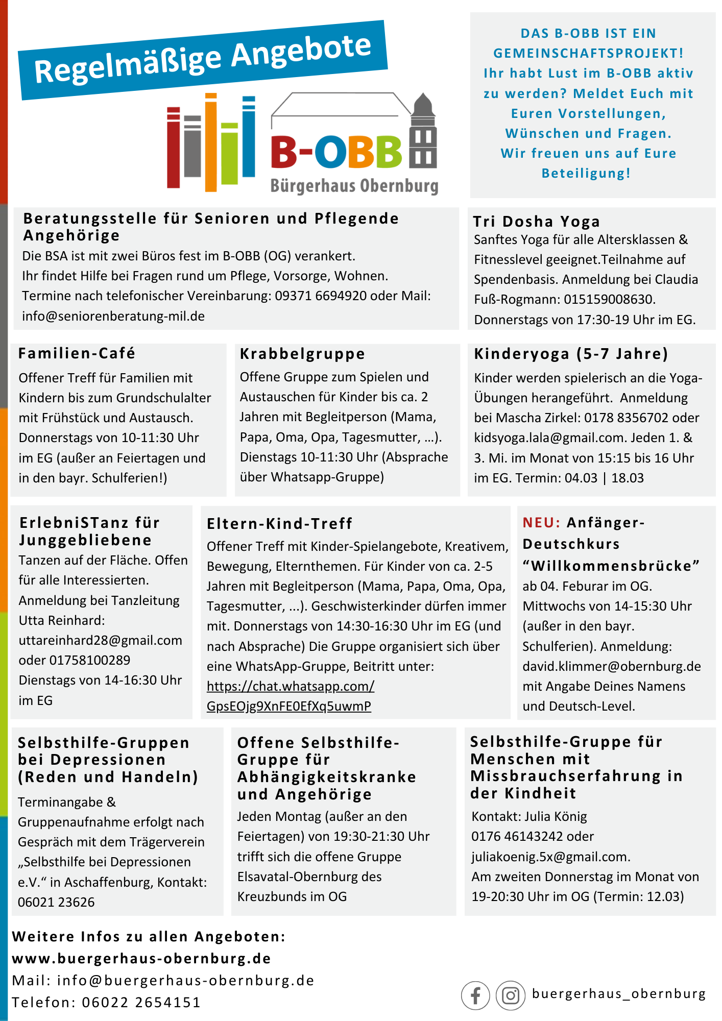 Nach drei Jahren der Sanierung wurde das Bürgerhaus „B-OBB“ im Sommer 2022 eröffnet. Hier findet ihr das Monatsprogramm mit allen Angeboten.