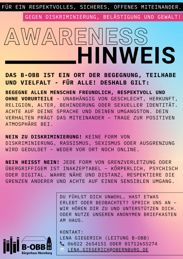 Das B-OBB (kurz für Bürgerhaus Obernburg) in der Unteren Wallstraße 24 ist eine öffentliche Einrichtung der Stadt Obernburg und ist ein Ort für alle Bürger:innen aus Obernburg, Eisenbach und der Region. Es ist ein Ort des gesellschaftlichen Austauschs, der Begegnung und Integration aller Menschen – unabhängig von Alter, Einkommen, Herkunft, Geschlecht und Religion. Das Gebäude kann von allen genutzt werden, die öffentliche Angebote schaffen wollen, die das Zusammenleben, die Kultur und das soziale Netz in der Stadt fördern. Details findet ihr im Leitbild.