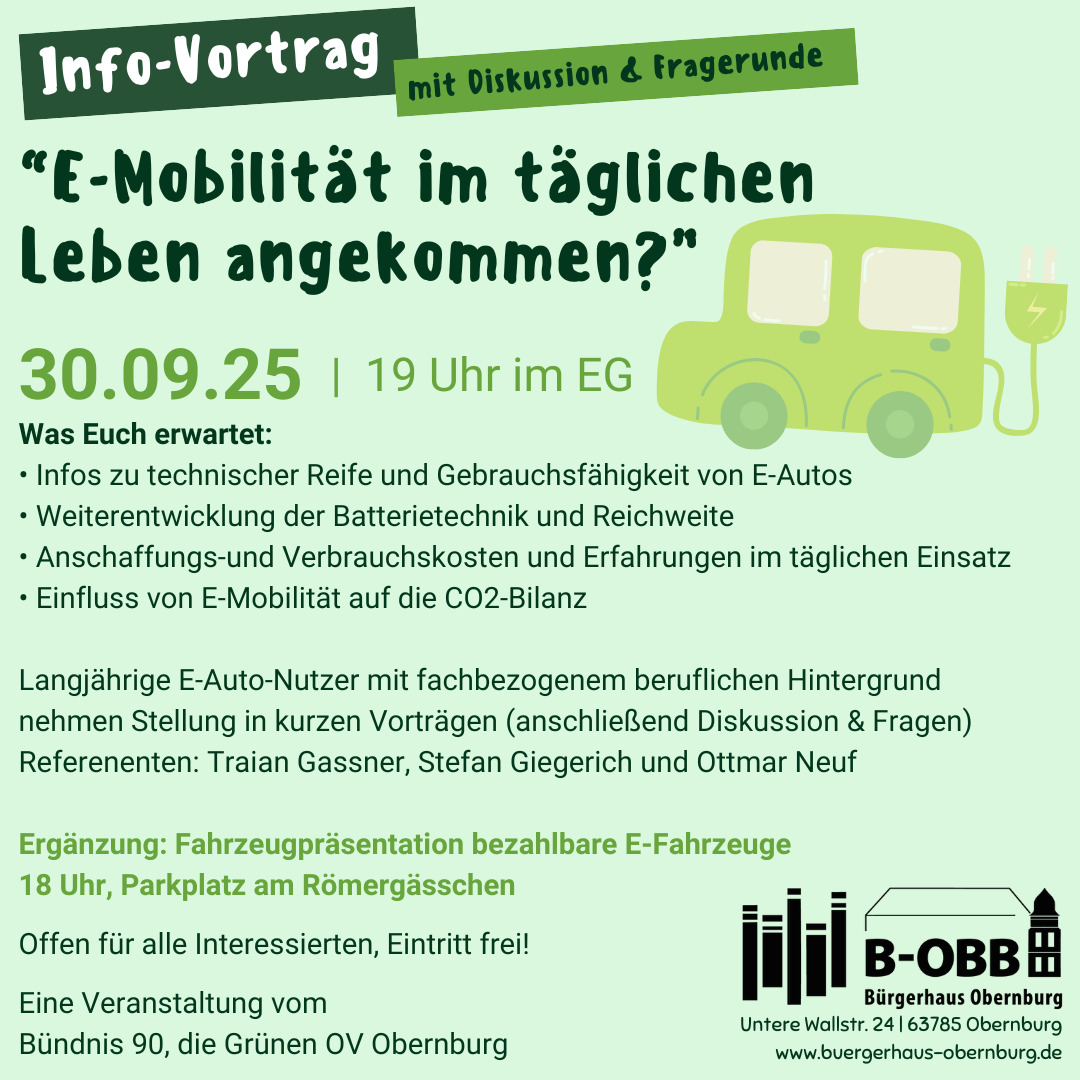 *Ergänzung: Ab 18 Uhr findet noch eine Fahrzeugpräsentation von bezahlbaren E-Fahrzeugen statt. Ort: Parkplatz am Römergässchen (wenige Gehminuten vom B-OBB entfernt).
