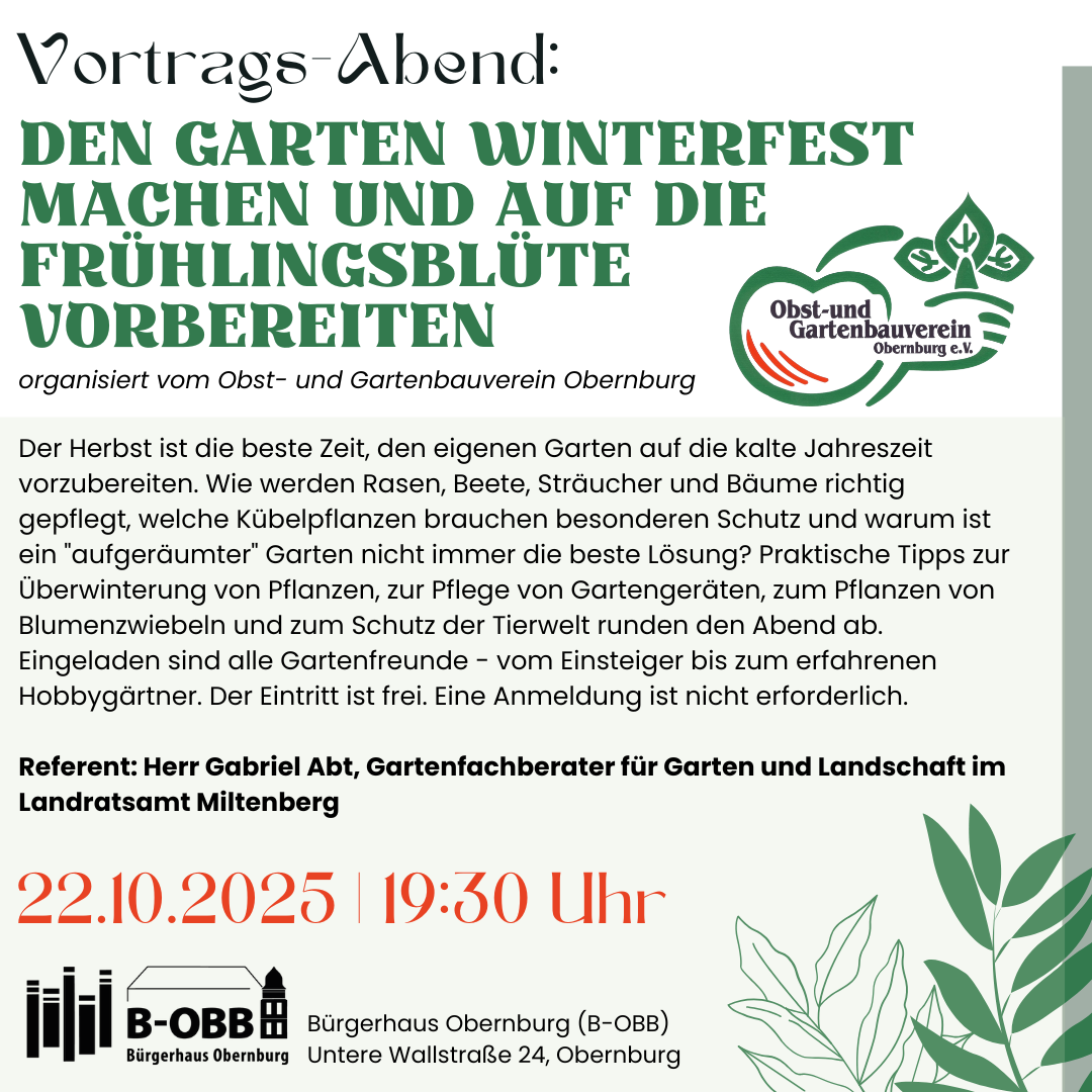 Der Herbst ist die beste Zeit, den eigenen Garten auf die kalte Jahreszeit vorzubereiten. Im Vortrag erfahren Sie, wie Rasen, Beete, Sträucher und Bäume richtig gepflegt werden, welche Kübelpflanzen besonderen Schutz brauchen und warum ein „aufgeräumter“ Garten nicht immer die beste Lösung ist. Praktische Tipps zur Überwinterung von Pflanzen, zur Pflege von Gartengeräten, zum Pflanzen von Blumenzwiebeln und zum Schutz der Tierwelt runden den Abend ab. Eingeladen sind alle Gartenfreunde – vom Einsteiger bis zum erfahrenen Hobbygärtner.