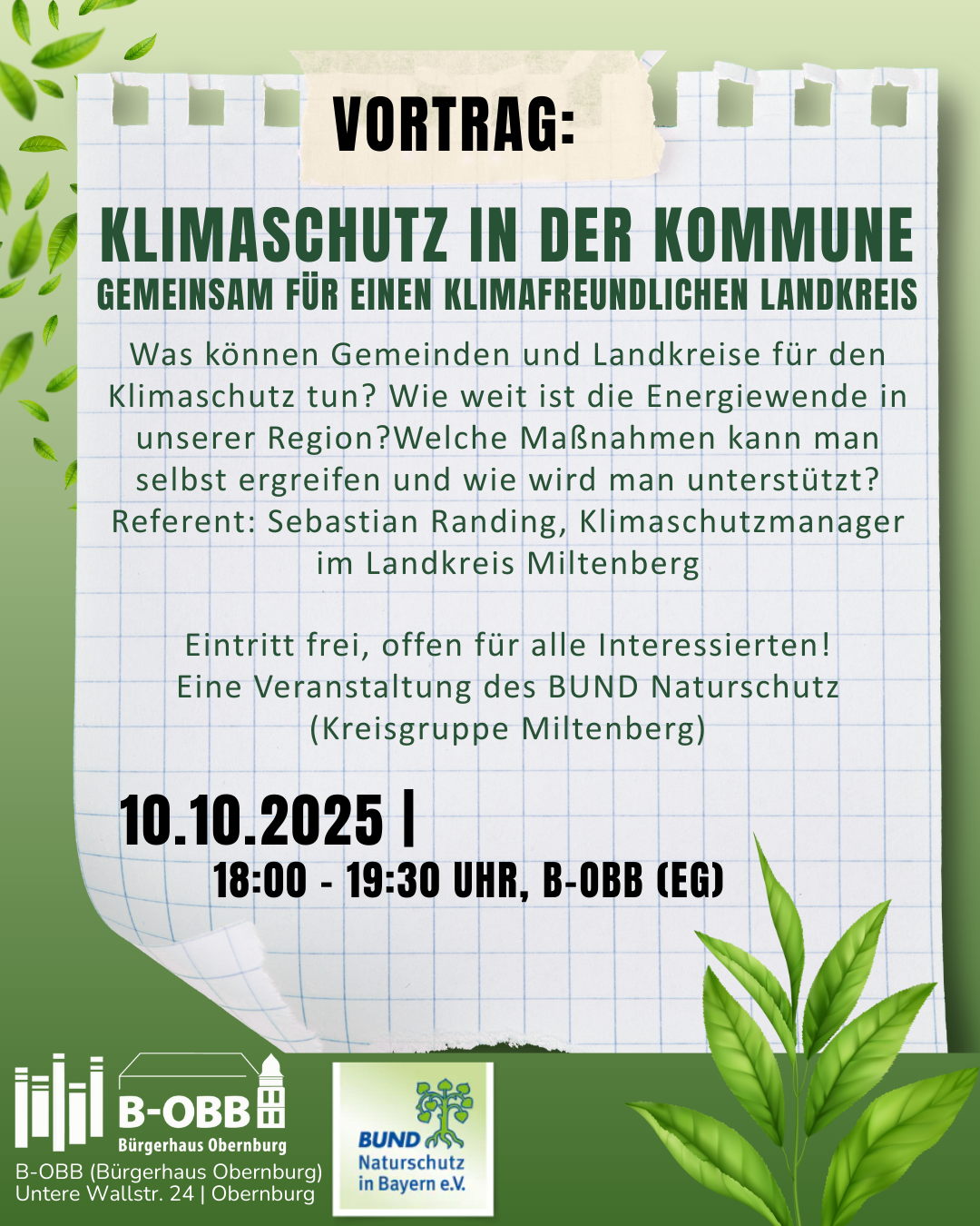 Der BUND Naturschutz, Kreisgruppe Miltenberg, lädt alle interessierten Bürgerinnen und Bürger herzlich zu einem Informationsabend über Klimaschutz auf kommunaler Ebene ein. Der Vortrag mit dem Titel „Klimaschutz bei uns: Handlungsmöglichkeiten für den Landkreis und seine Gemeinden“ findet am Freitag, den 10. Oktober, um 18 Uhr im B-OBB in Obernburg (Untere Wallstraße 24) statt.