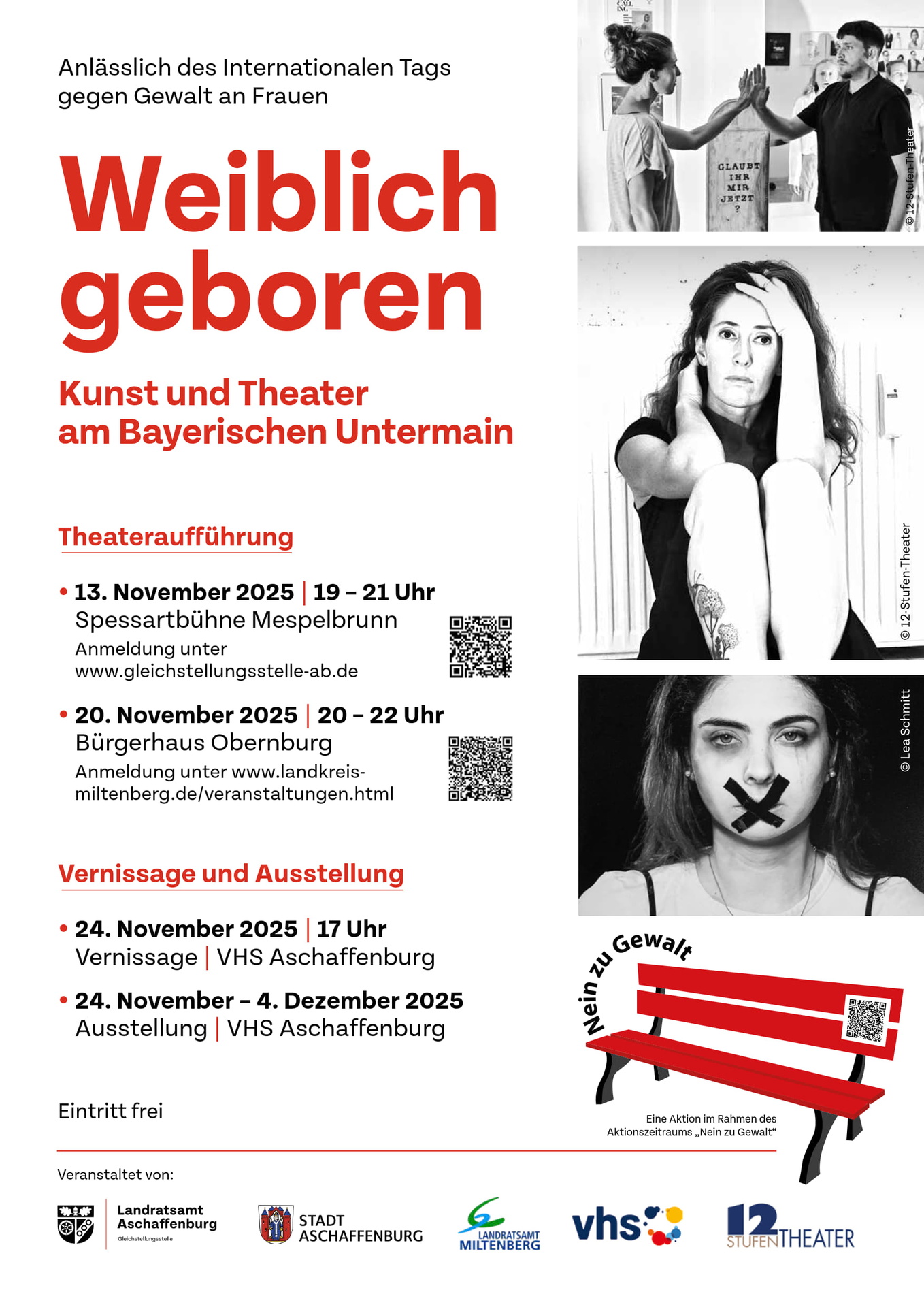 In diesem Rahmen zeigen die Gleichstellungsstellen der Stadt Aschaffenburg und der Landkreise Aschaffenburg und Miltenberg das Theaterstück „Weiblich geboren“ (12-Stufen-Theater) in Mespelbrunn und Obernburg.