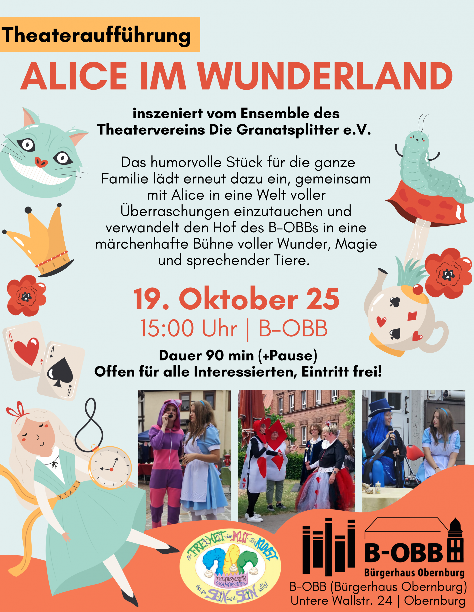 Das Ensemble des Theatervereins Die Granatsplitter e.V. bringt seine fantasievolle Inszenierung von „Alice im Wunderland“ diesmal zu uns und verwandelt den B-OBB-Innenhof in eine märchenhafte Bühne voller Wunder, Magie und sprechender Tiere für die ganze Familie.