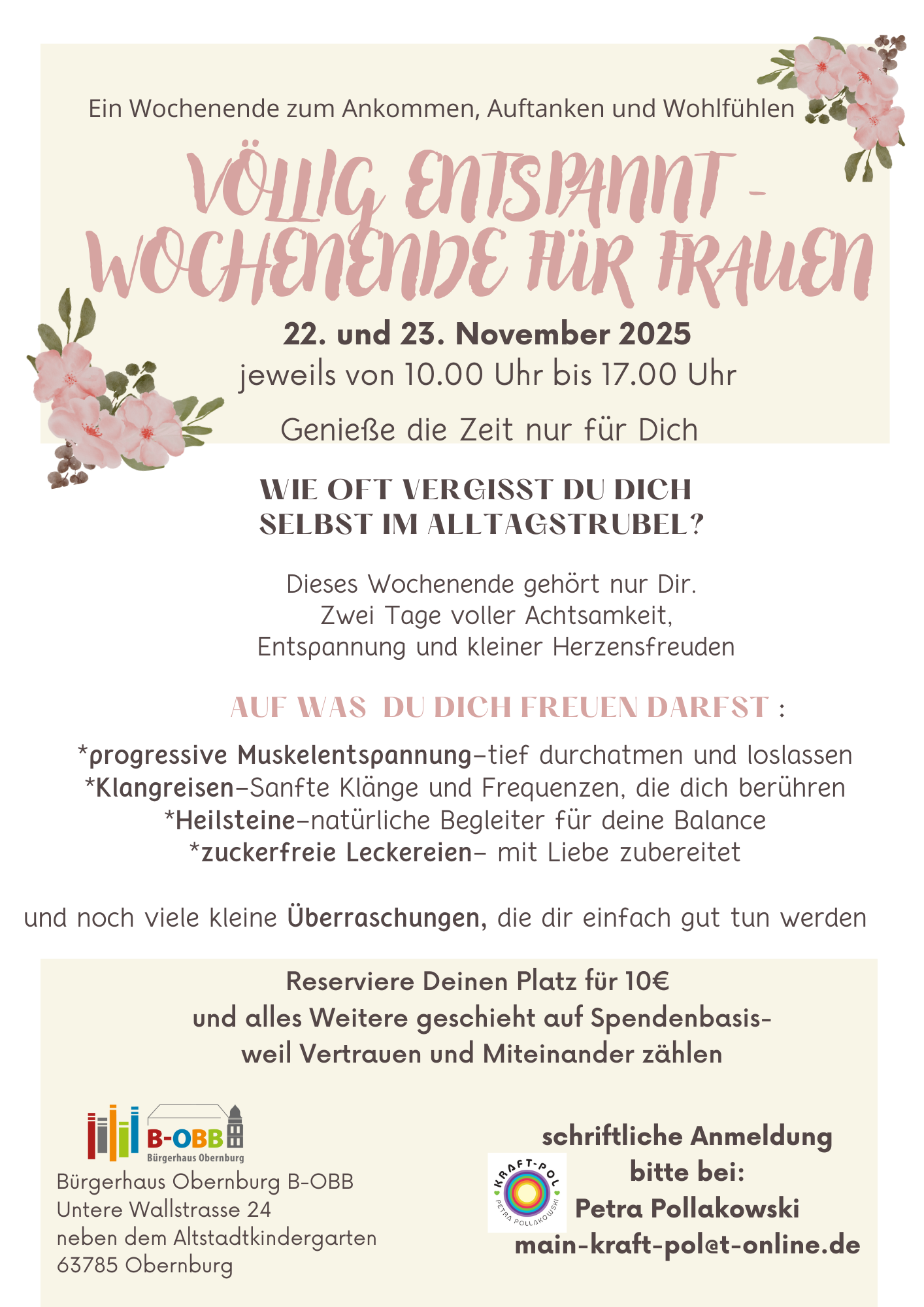 Das Bürgerhaus Obernburg verwandelt sich in einen Ort der Ruhe und Leichtigkeit. Zwei Tage lang darfst du den Alltag hinter dir lassen, durchatmen und dir selbst die Aufmerksamkeit schenken, die im Trubel oft zu kurz kommt.