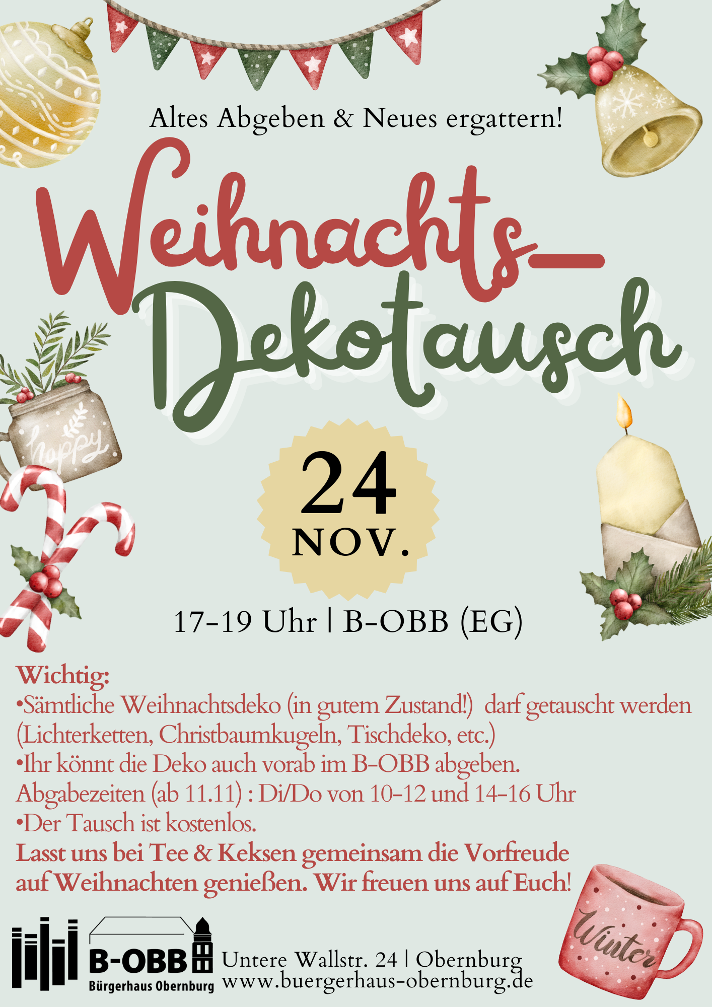 Wir laden euch herzlich zu unserem 2. Weihnachtsdeko-Tausch ein! Bringt eure nicht mehr benötigte, aber gut erhaltene Weihnachtsdekoration mit und entdeckt neue Schätze, die euer Zuhause in der festlichen Zeit erstrahlen lassen.