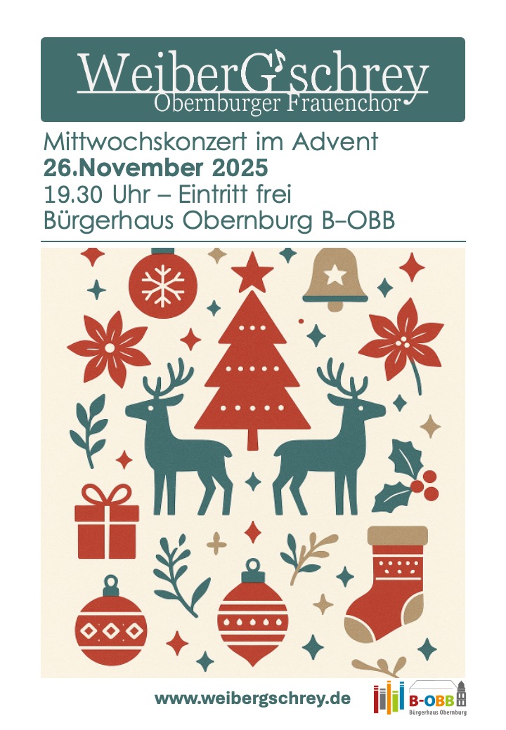 Der Obernburger Frauenchor WeiberG’schrey lädt zum traditionellen Mittwochskonzert im Advent. Unter der Leitung von Michaela Markert führt der Chor das Publikum durch einen abwechslungsreichen Abend: Das Repertoire reicht von besinnlich über international bis hin zu humorvoll. Neue Stücke bereichern das Programm dabei ebenso wie auch beliebte WeiberG’schrey-Klassiker und traditionelle Weihnachtslieder.