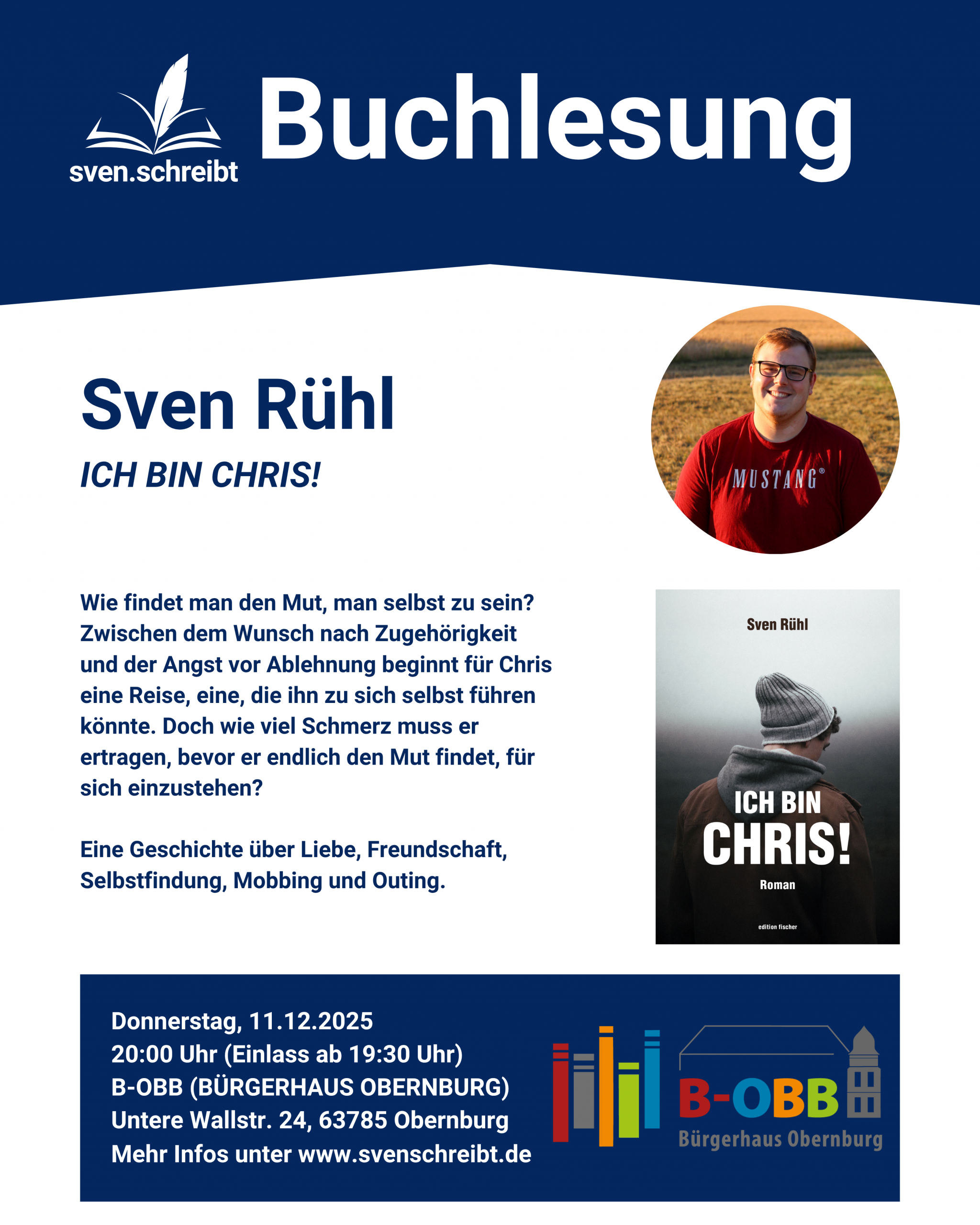 Im Mai 2025 erschien der Debütroman „Ich bin Chris!“ von Sven Rühl (23, aus Eschborn) im R. G. Fischer Verlag. Der queere Coming-of-Age-Roman erzählt eine bewegende Geschichte vom Suchen und Finden, von Mobbing, erster Liebe, inneren Kämpfen – und vom stillen Aufbrechen.