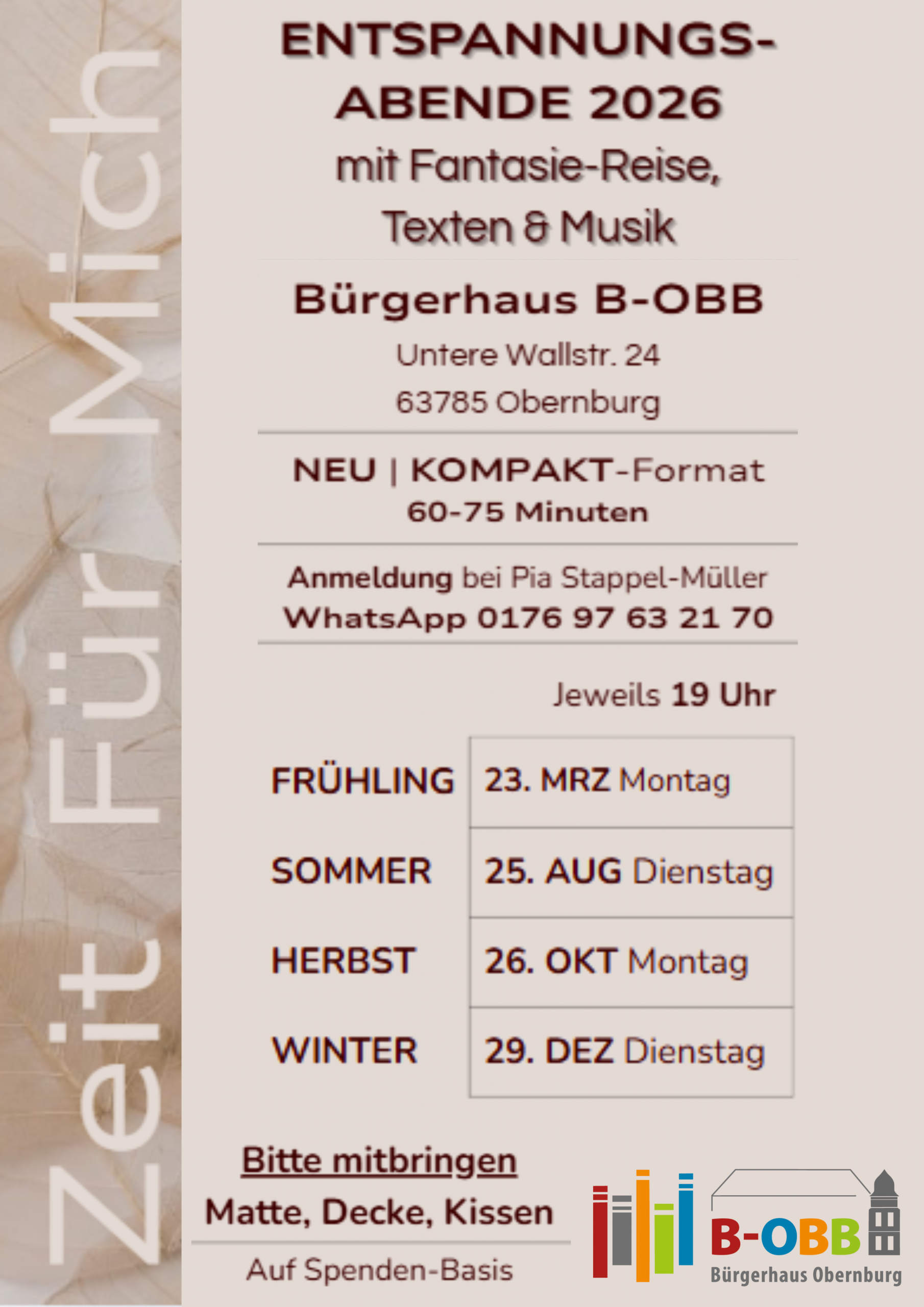 Die Veranstaltungsreihe „Zeit für mich“ ist ein Entspannungsangebot für alle Interessierten mit Fantasie-Reise, Texten und Musik! Ab 2026 als Kompakt-Format für 60-75 Minuten.